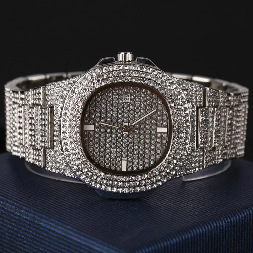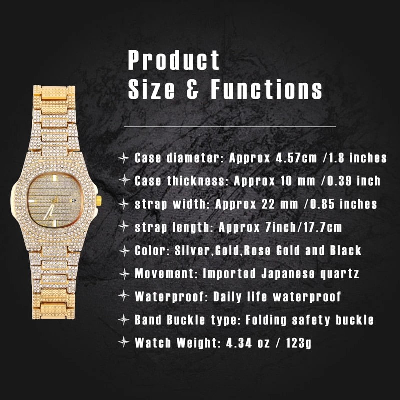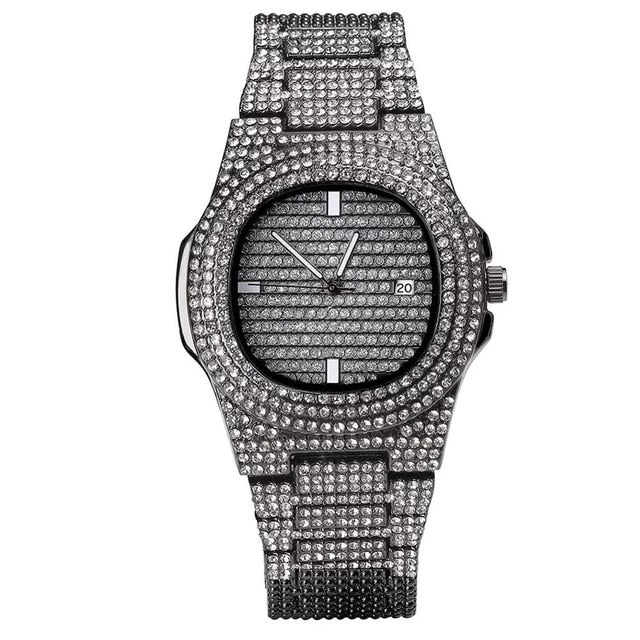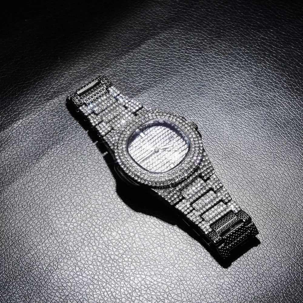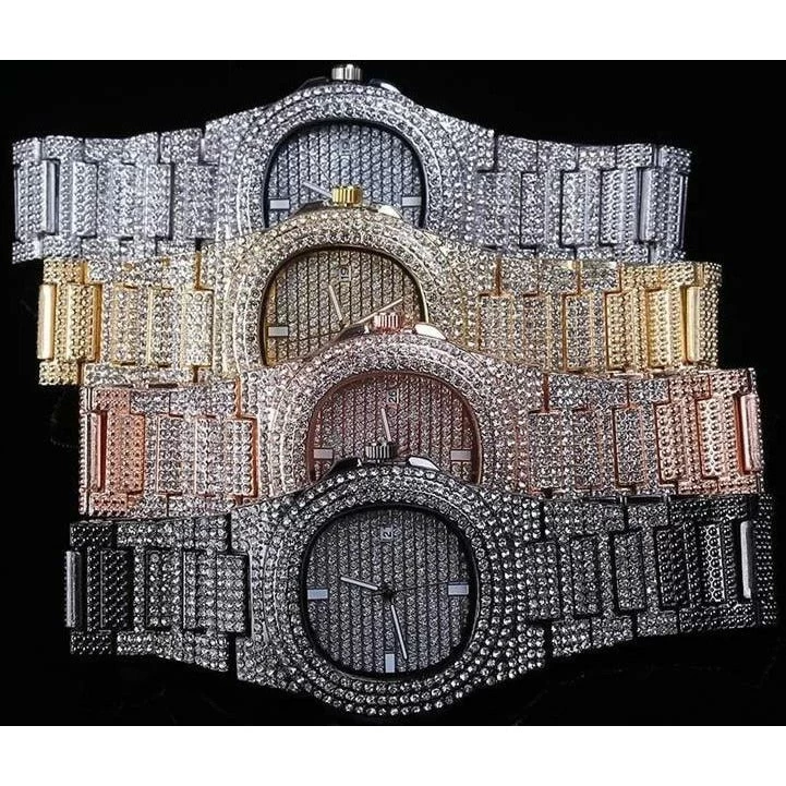 Iced out European engineered 2-Tone luxury wrist watch with micro paved 2-tone diamonds. All with hand picked certified colourless (D-E graded) rust free diamonds.
