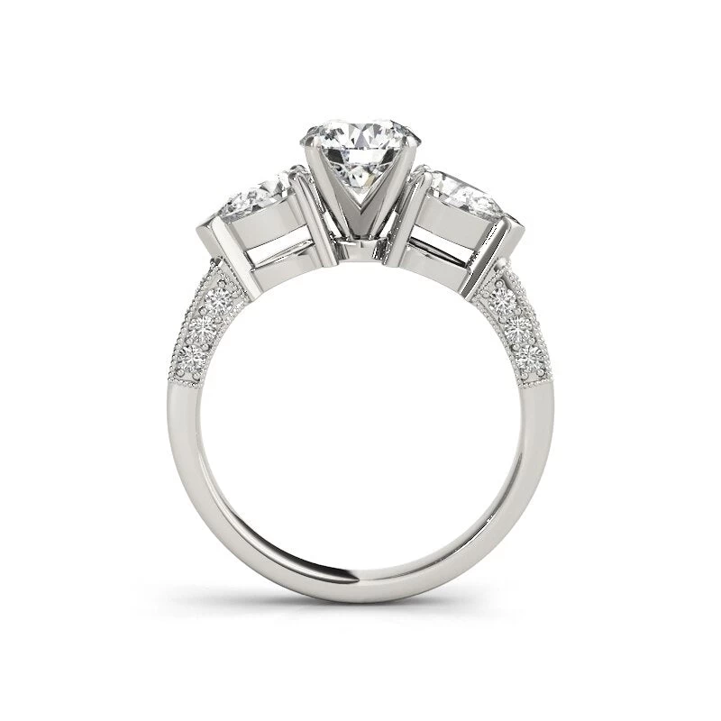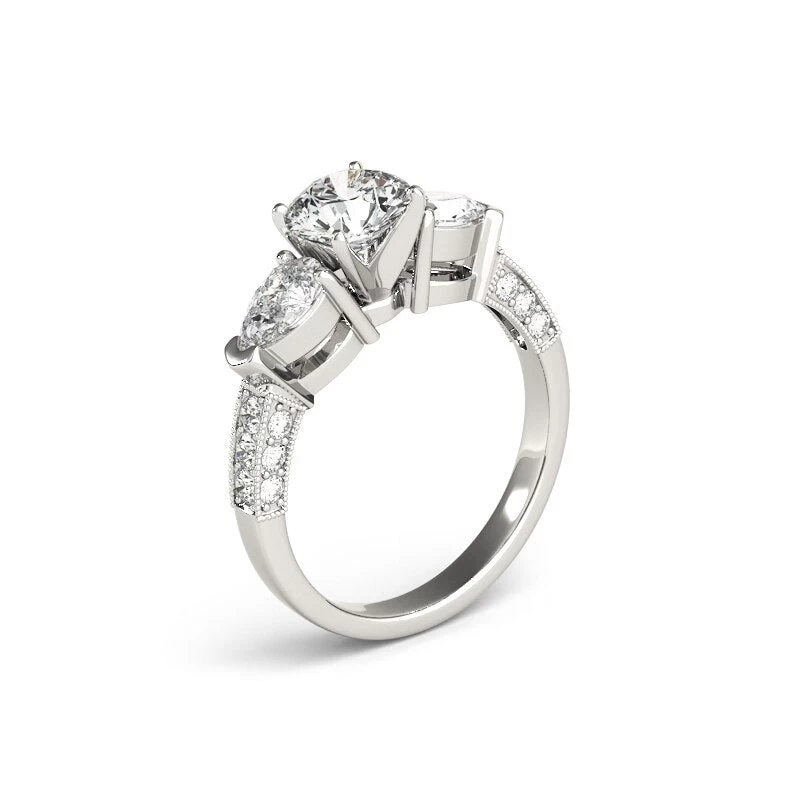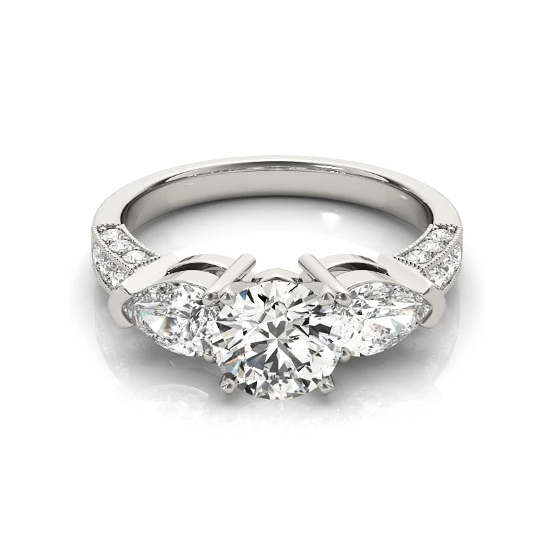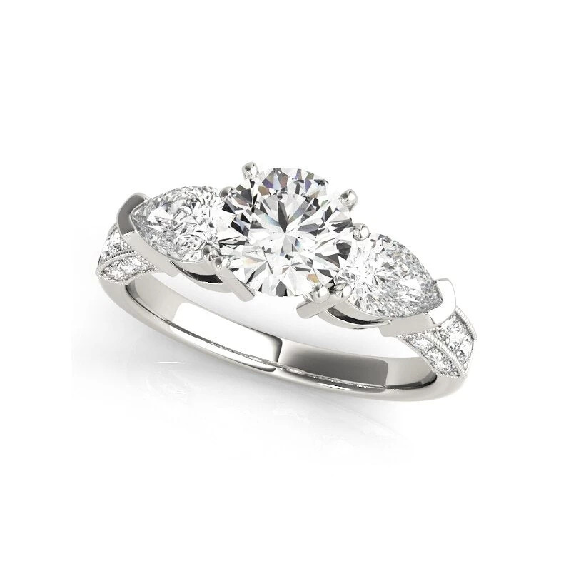 This 925 Sterling Silver Royal ring features a rounded center Round Cut Diamond with 2 Pear Shaped Diamonds, complimented by an 18kt white gold frame Finish.